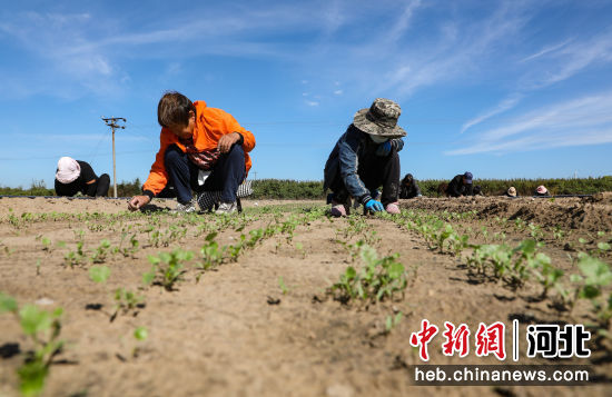 在滦南县青坨营镇西水清庄村,村民们正忙着给香菜疏苗。 刘兰伟 摄