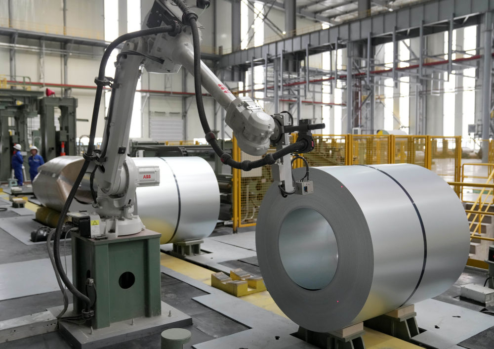 ↑10月19日,河钢浦项汽车板合资项目生产线上的机器人在给成品钢板喷产品代码。新华社记者 杨世尧 摄