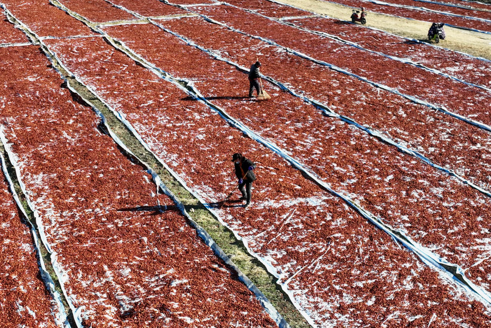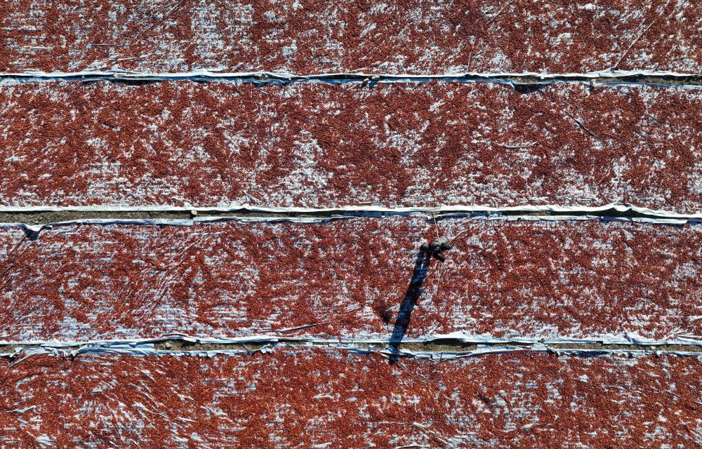 ↑11月14日,河北省遵化市侯家寨镇的农民在晾晒用于中药材的山楂片(无人机照片)。新华社记者杨世尧摄