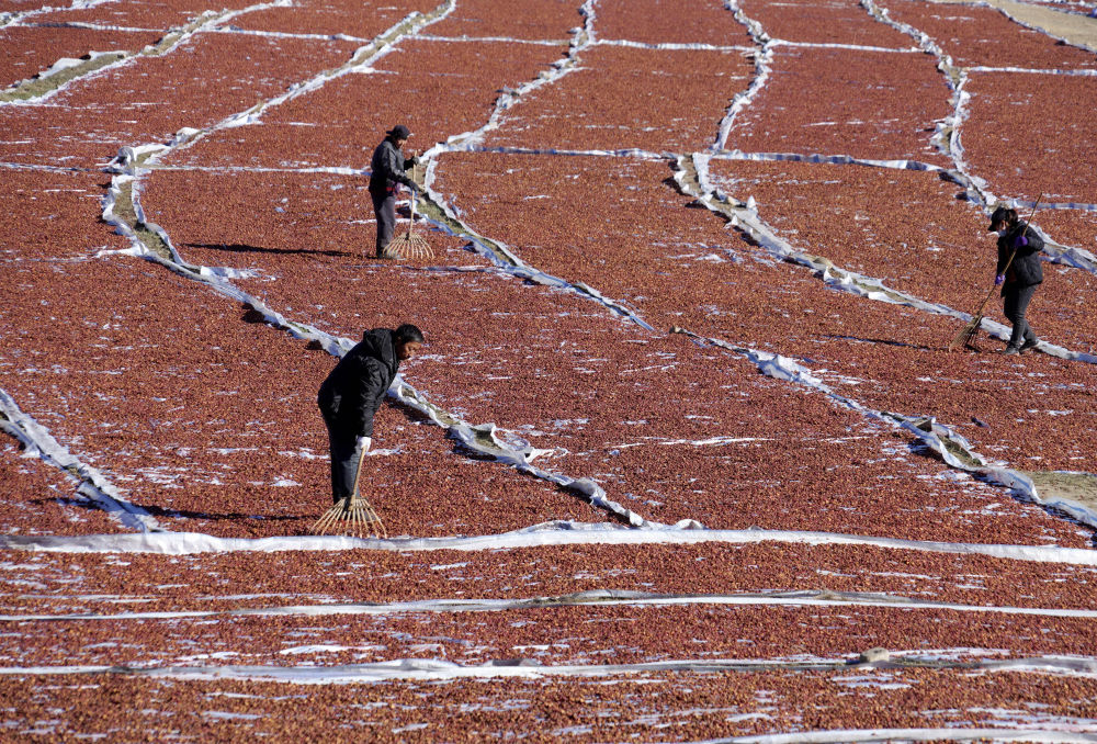 ↑11月14日,河北省遵化市侯家寨镇的农民在晾晒用于中药材的山楂片。新华社记者杨世尧摄