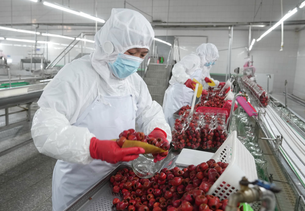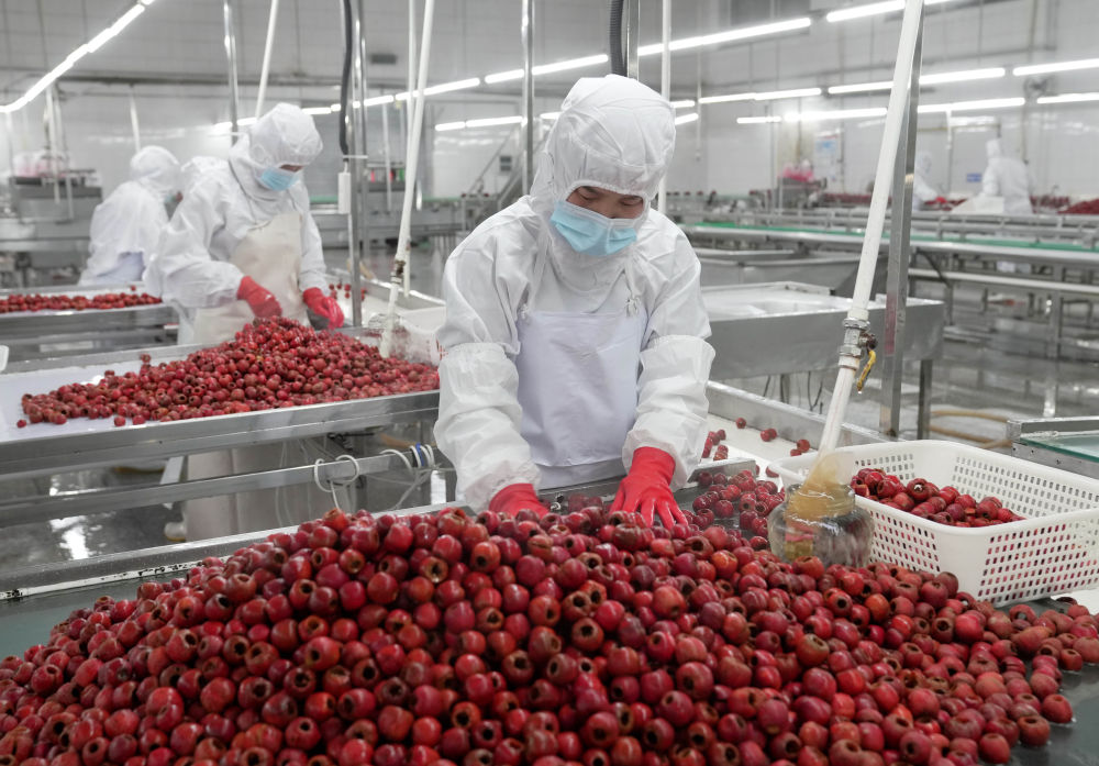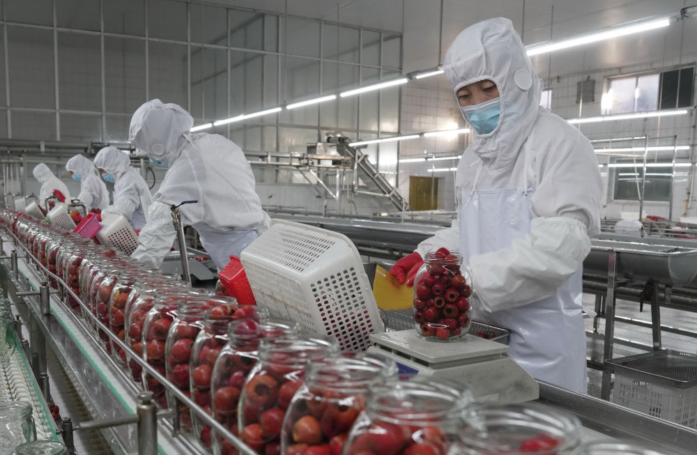 ↑11月14日,工人在河北省遵化市一家食品企业的山楂罐头生产车间工作。新华社记者杨世尧摄