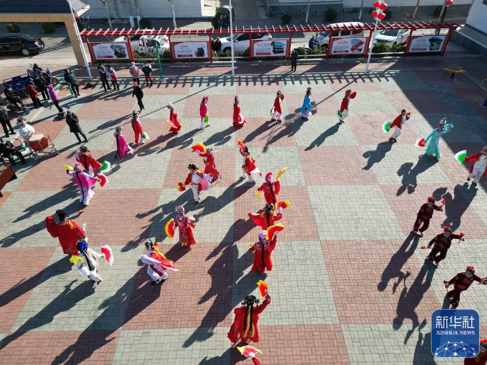 11月17日,河北省滦州市葛庄村地秧歌队队员在村广场上表演(无人机照片)。