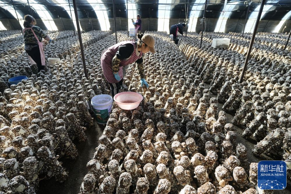 11月17日,河北省滦州市榛子镇杨家庄村村民在香菇大棚内劳作。