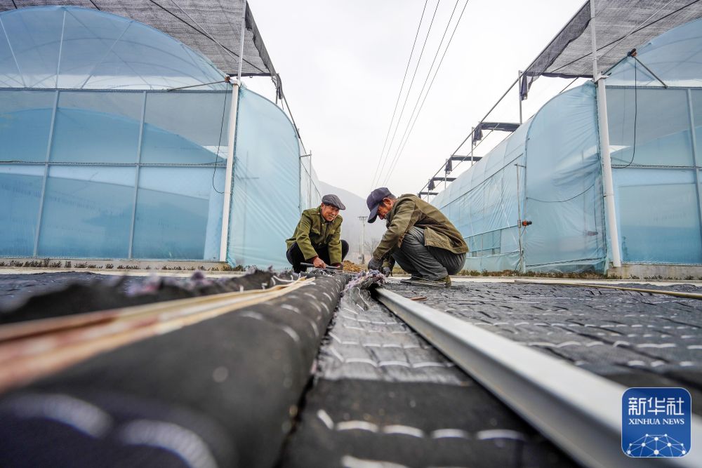 11月22日,河北省遵化市石门镇农民在设施大棚检查增温设备。