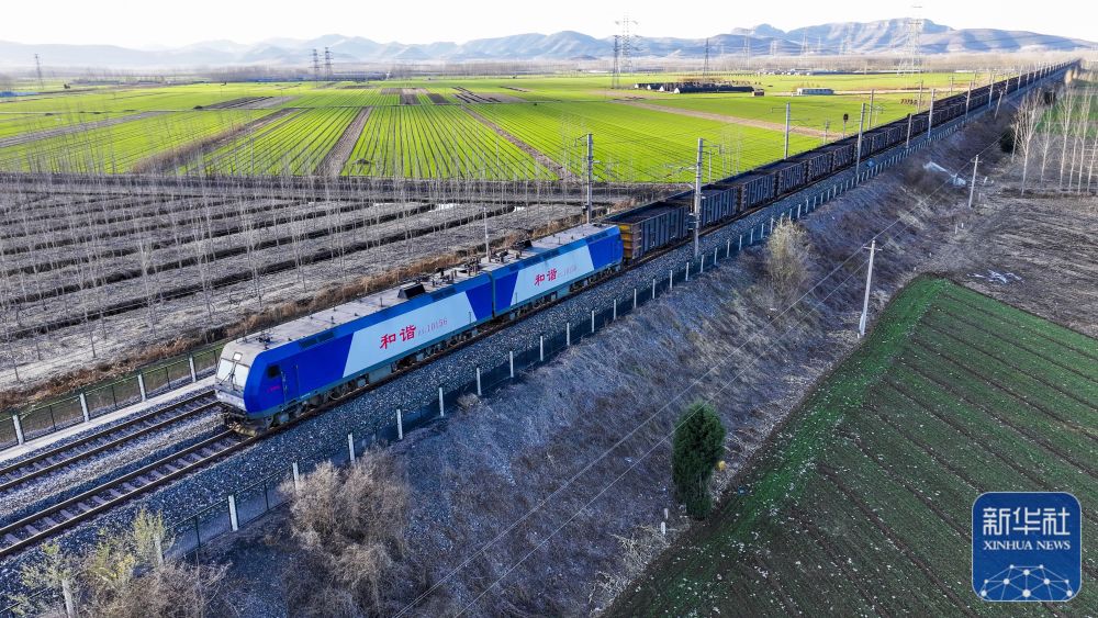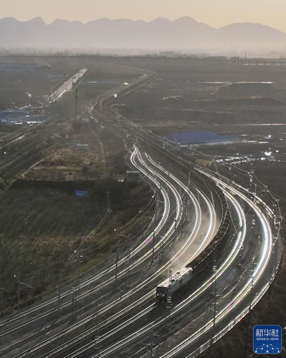 11月23日,在河北省遵化市,一列运煤重载列车驶向秦皇岛方向(无人机照片)。新华社发(刘满仓摄)