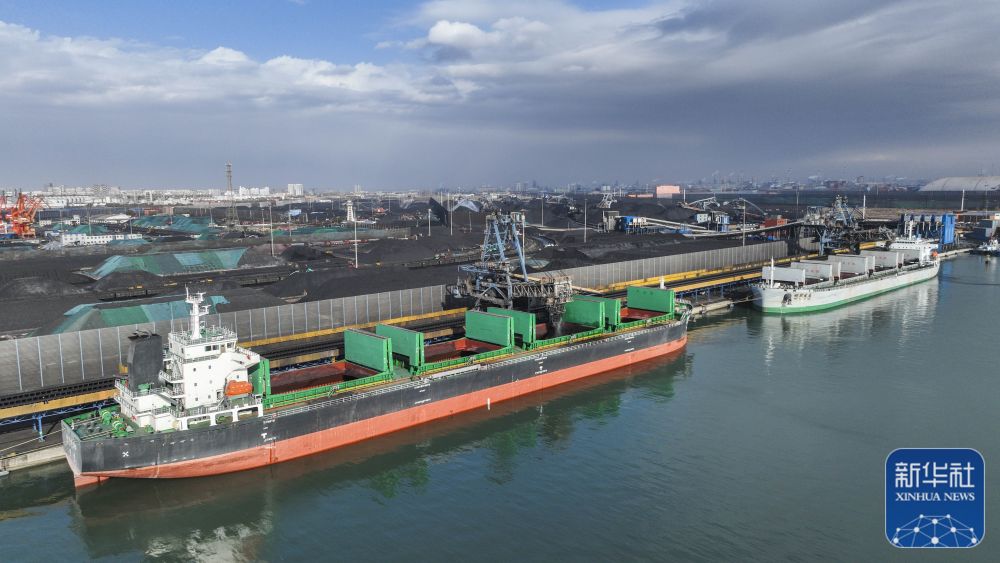11月23日,轮船停泊在唐山港京唐港区煤炭码头进行装船作业(无人机照片)。新华社发(李磊摄)