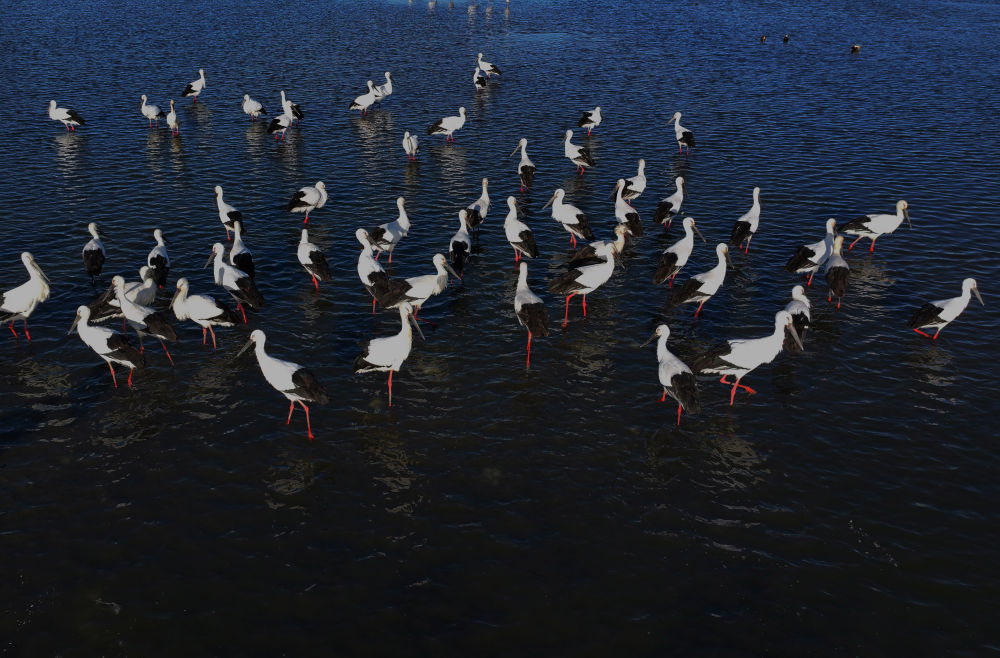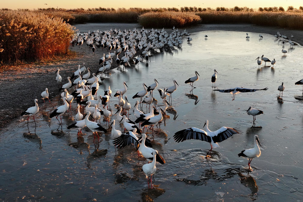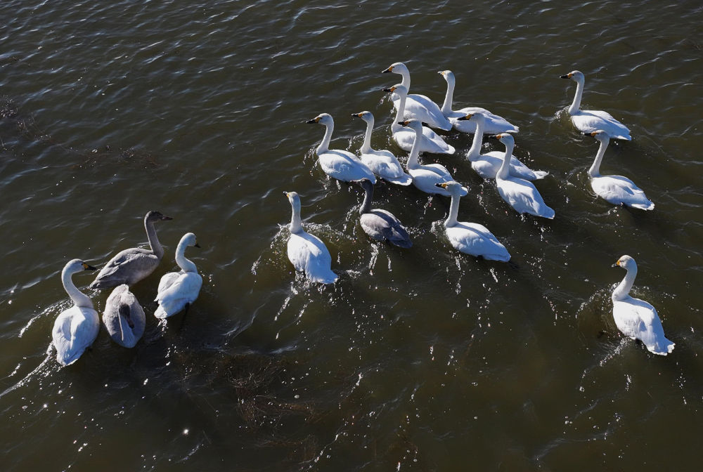 ↑11月25日,东方白鹳在河北省唐山市沿海湿地觅食(无人机照片)。↑11月25日,东方白鹳在河北省唐山市沿海湿地觅食(无人机照片)。 ↑ 11月25日,天鹅在河北省唐山市丰南区黑沿子镇沿海湿地水面上游弋(无人机照片)。