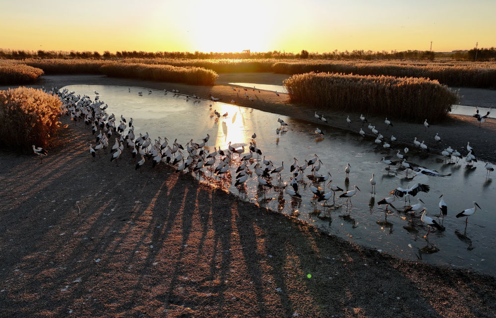 近日,大批东方白鹳、天鹅、大雁等候鸟飞抵河北省唐山市沿海湿地觅食、停留,形成一道靓丽的风景。 新华社记者 杨世尧 摄