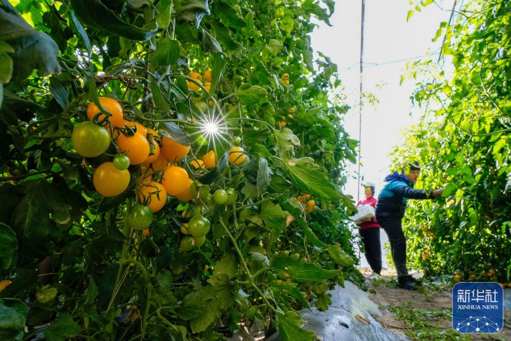 ↑11月26日,河北省滦州市雷庄镇后店子村农民在大棚内采摘水果西红柿。