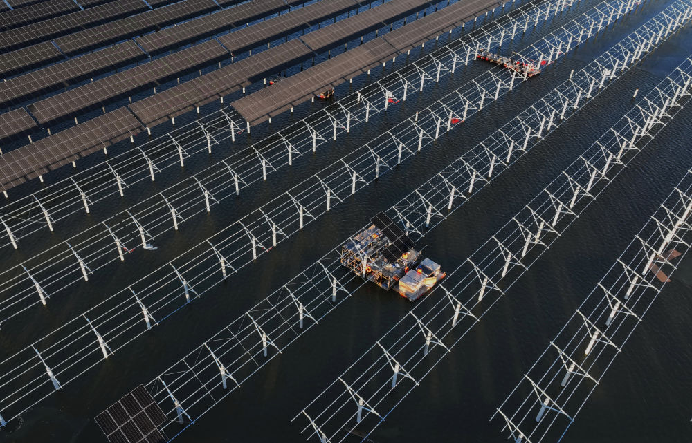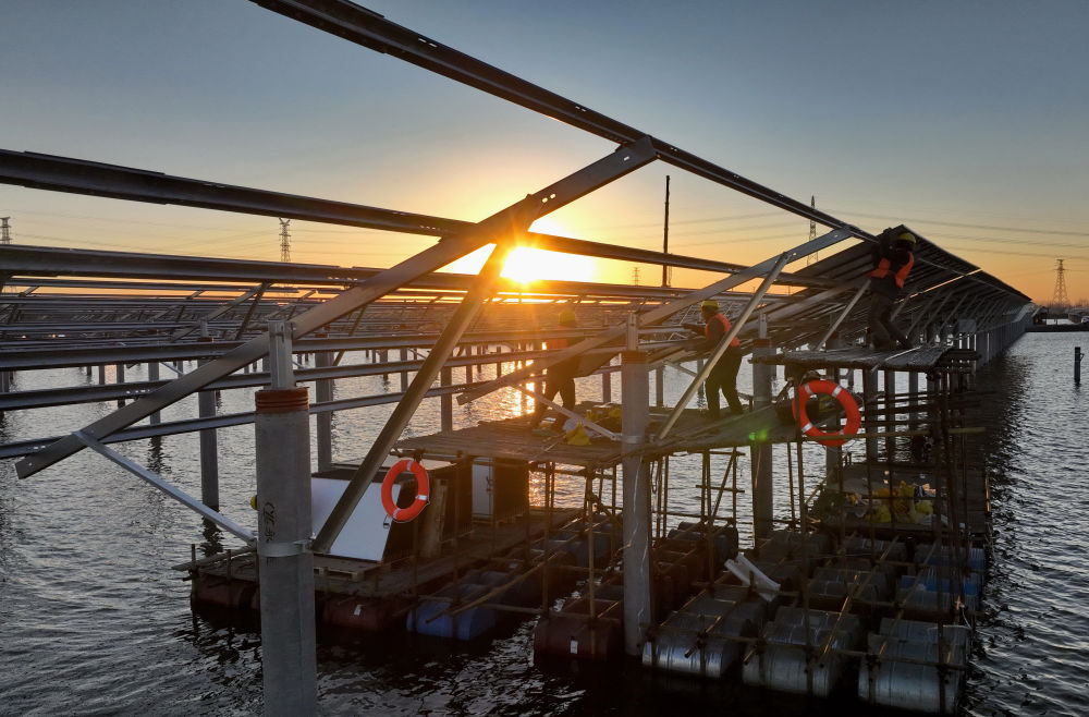 12月1日,工人在河北省唐山市丰南区黑沿子镇渔光互补项目建设工地施工(无人机照片)。