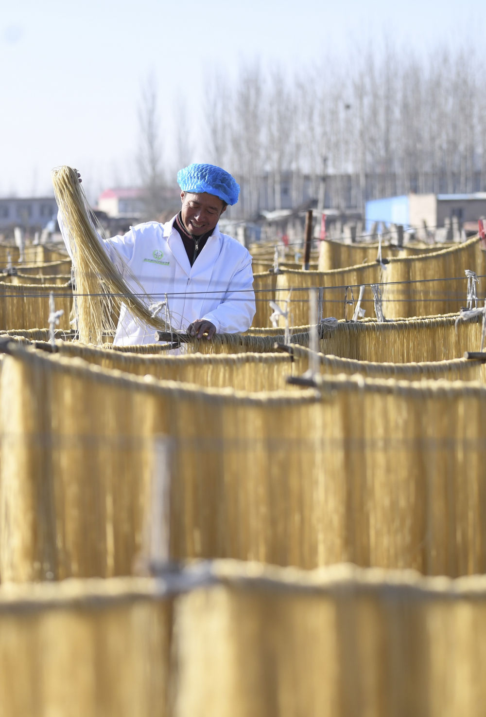 ↑12月6日,河北省迁安市五重安镇茶井沟村的村民在晾晒刚制作好的粉条。