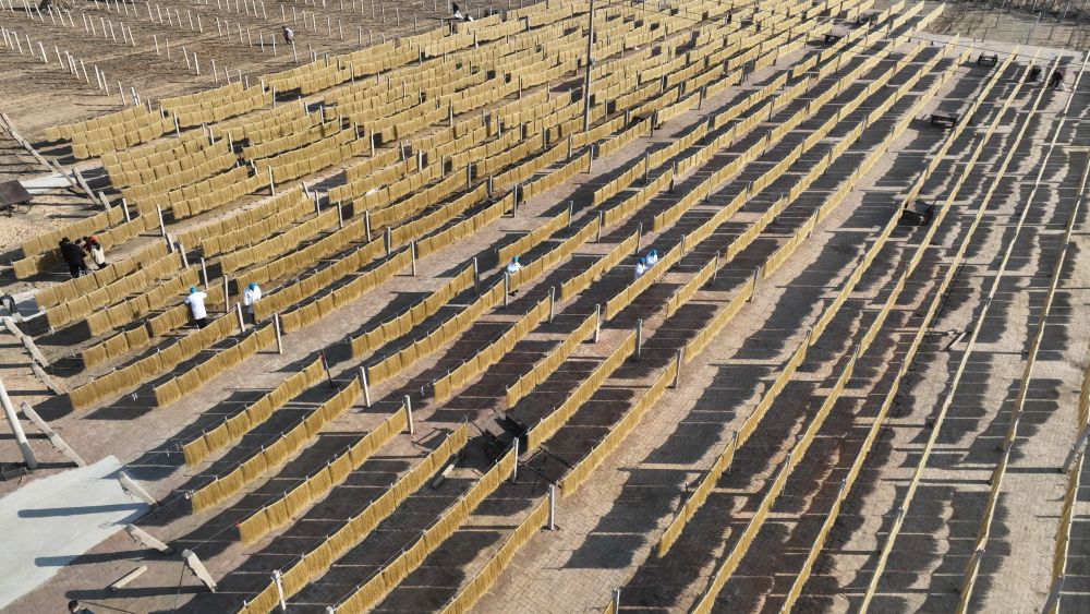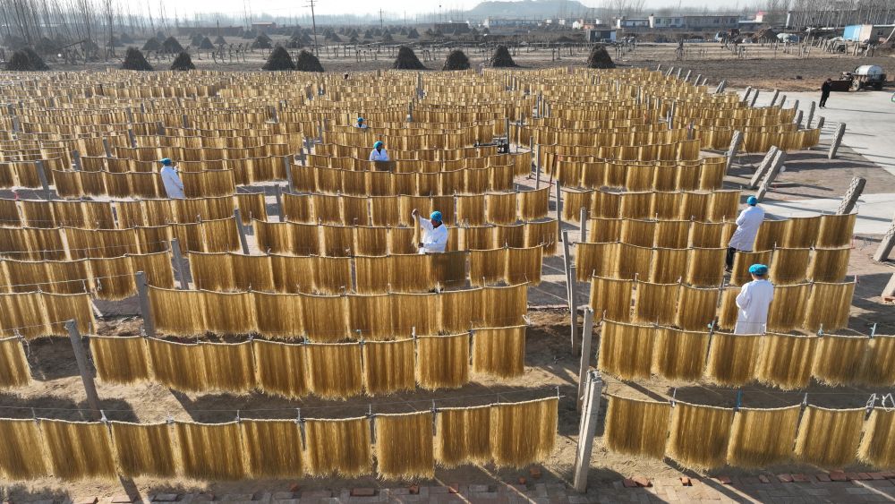 ↑12月6日,河北省迁安市夏官营镇梁庞庄村一家粉条加工企业的工人在晾晒粉条(无人机照片)。