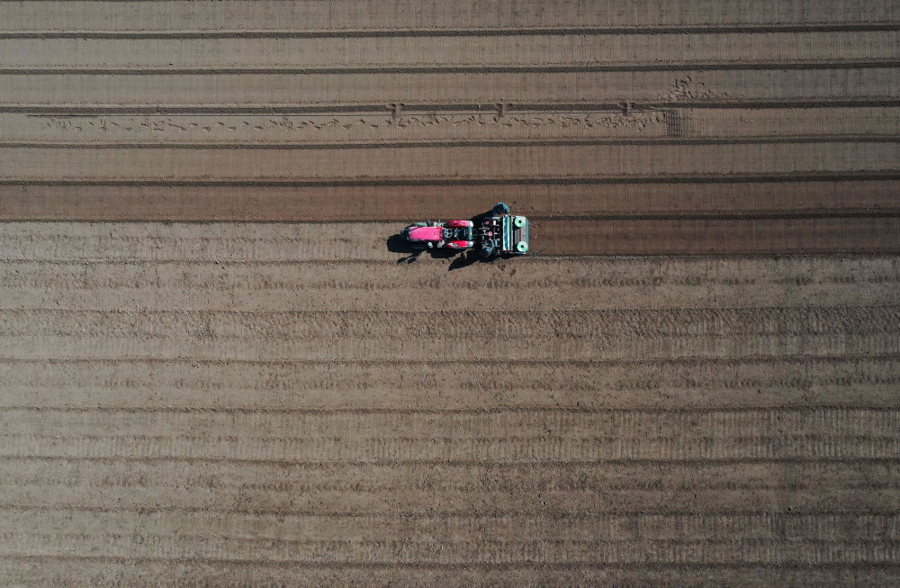 ↑3月12日,河北省滦州市油榨镇的农民在田间使用播种机种植豌豆(无人机照片)。