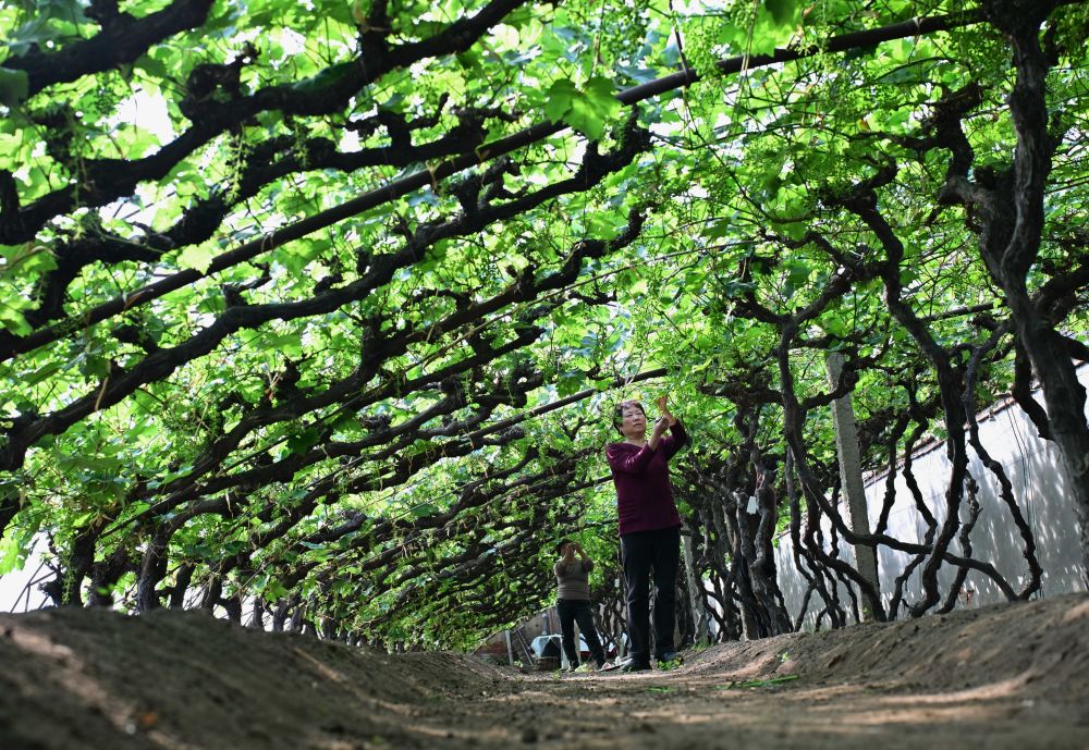 ↑3月12日,河北省滦州市东安各庄镇的果农在大棚内管护葡萄。