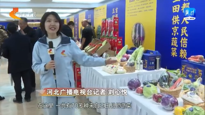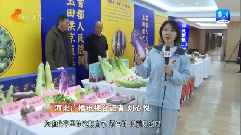 我现在来到了河北净菜·"玉田供京蔬菜"北京推介会的活动现场,在这里,一共有70多种来自玉田县的蔬菜进行集中的展示对接,并且和北京各大商超、农产品市场进行"面对面"的交流。那在这里可以看到,像是萝卜、青椒,还有我手里的这个圆白菜,都是今天一大早刚刚采摘的。