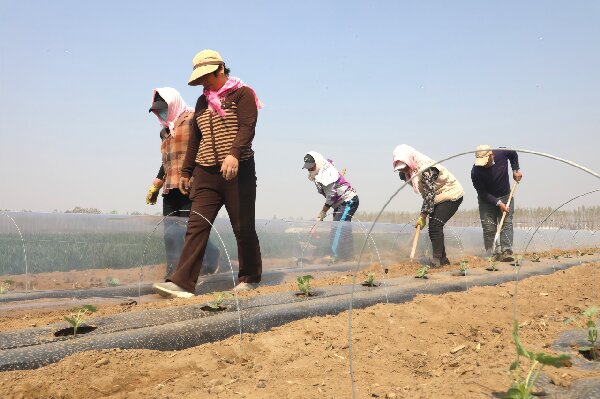 滦南县青坨营镇西水清庄村瓜农正在移栽西瓜秧苗。张悦 摄